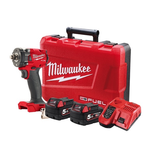 MILWAUKEE M18 FUEL 1/2 COMPACT IMPACT WRENCH WITH FRICTION RING – KIT INCLUDES 2x 5.0Ah REDLITHIUM BATTERIES, M12&M18 MUTLIVOLT CHARGER, CASE