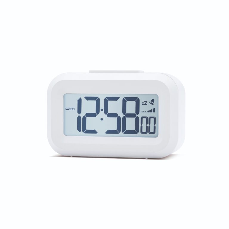 A handy-sized LCD alarm clock with white backlight that features a snooze and volume control.