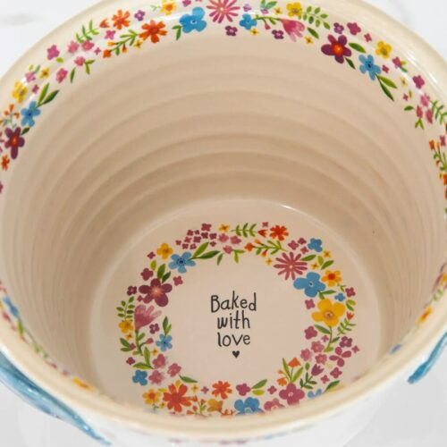 Create and serve delicious bread in this Artisan Bread Crock! Cute, little details have been added to this stoneware bread crock like a floral-printed inner and outer rim, contrasting blue handles and even a sweet message on the bottom that reads “Baked With Love”. Also included is an adorable booklet with six different bread recipes. So whether you’re new to baking or an experienced baker, you’ll love making anything from a classic white bread to a blueberry lemon pull apart bread!
