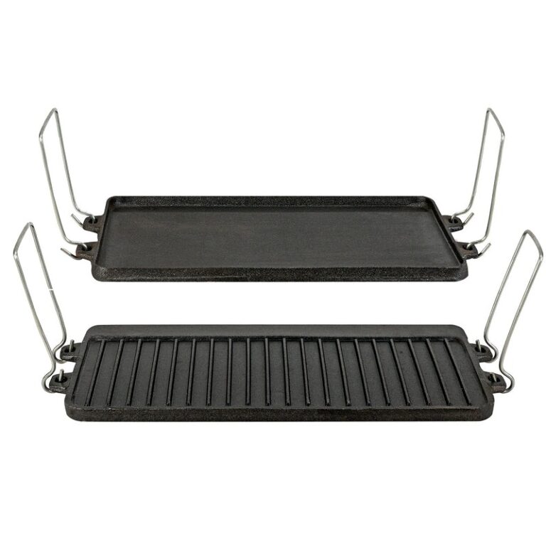 Reversible cast iron plate with wire handles. Suitable for 2 burner stove. Idea for camping, hunting, tramping, fishing and home use.