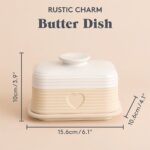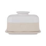 The durable, thick base is designed with parallel ridges ensuring the block of butter stays securely in place. The elegant, embossed lid will keep the contents fresher for longer. Fits up to 500g of butter and measures H10cm x W15.6cm x D10.6cm. Made from Stoneware, the butter dish is dishwasher safe.