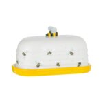 Made from quality ceramic, the butter dish is decorated with cute flying bumble bees and decorative spots.