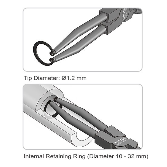 Extra long slim tip for easy access to difficult-to-reach snap ring