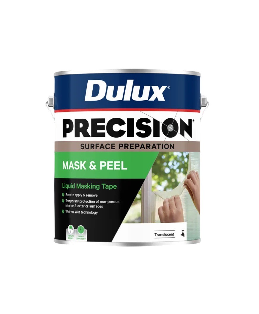Dulux PRECISION Mask & Peel is a low VOC, water based, peelable liquid masking tape for temporary protection of surfaces including glass, stainless steel, laminates, powder coated and smooth non-porous surfaces.