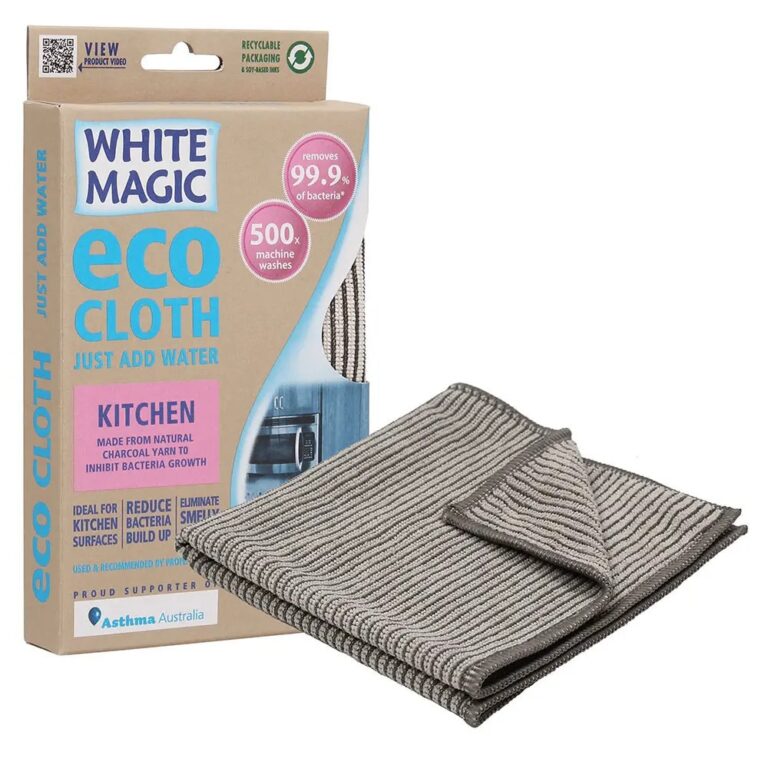 The White Magic Kitchen Microfibre Eco Cloth starts with the premium blend of microfibre that is strong, absorbent and aggressive for dirt pick up. This is then combined with a unique blend of charcoal yarn that inhibits the growth of bacteria so avoiding cloth odour and contamination of food preparation areas. Perfect for cleaning benchtops, kitchen table, cooktop, sink, etc.
