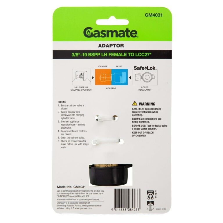 The GM4031 bbq and camping gas adaptor allows you to convert a 3/8″-19 BSPP-LH outlet to LCC27.