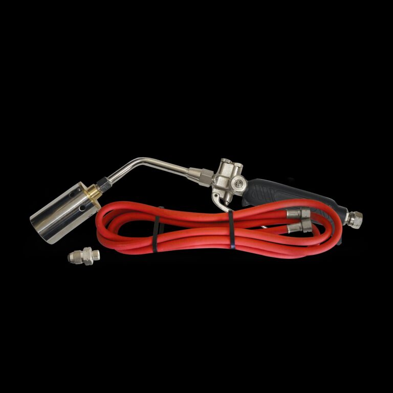 Using propane (LPG) fuel gas mixed with atmospheric air it produces a powerful and highly stable flame even in most adverse conditions. It is a proven design incorporating the latest technical features necessary to meet the ever changing applications and requirements for gas brazing and heating. The heating torch handle is fitted with an adjustable pilot light for a soft flame burn, depressing the lever delivers full gas flow to supply the heating flame. The heating flame is adjustable by the needle valve located on the torch handle.