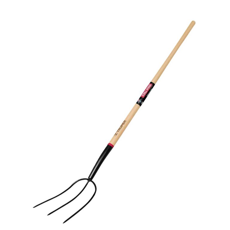 One-piece 3 tined tempered and pointed forged steel head. American Ash hardwood handle, polished, lacquered, profiled and waxed. Metal collar to join the handle to the head. Handle Length: 54″ (4-1/2ft). Tines Length: 8″
