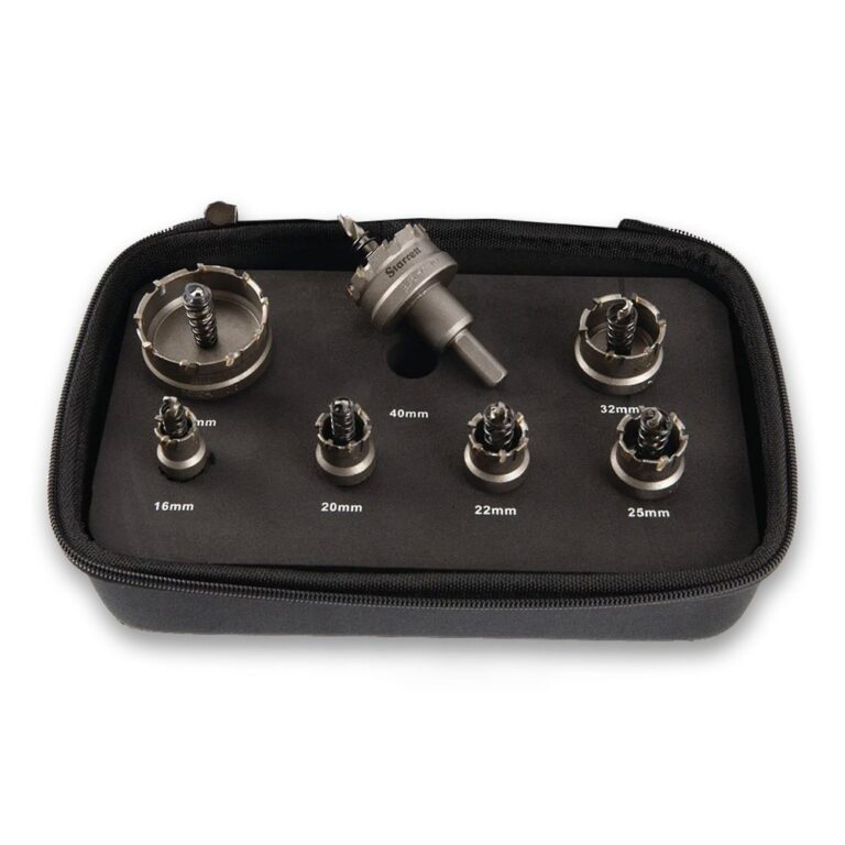 Ideal for cutting stainless and high alloy steels, non-ferrous metals and reinforced fabrics at a much faster speed than bi-metal holesaws. Tough, tungsten carbide tipped teeth have a positive cutting angle which provide fast and efficient removal of chips and swarf, and a long working life. Safety stop at the base of the hole saw prevents drilling beyond the maximum cutting depth of 13mm. Complete assembly including drive arbor and pilot drill (replacement pilot drills available).