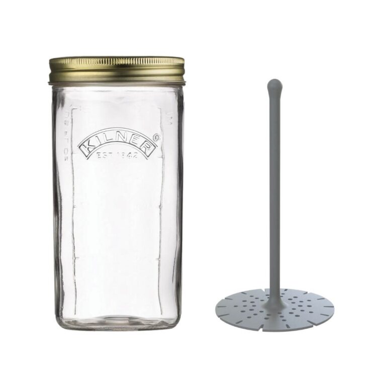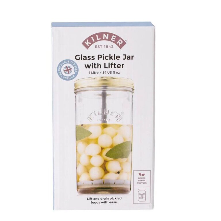 Featuring a 2-piece lid system which comprises of a tin disc and screw band ensuring a secure vacuum seal is achieved, keeping the contents fresher for longer. The jar capacity is 1 litre/1000ml which is perfect for pickling and preserving large, whole fruits and vegetables. The wider opening allows for easy filling and decanting. The jar has embossed ML volume indicators on the side and enhanced with the authentic Kilner® embossed logo on the front.