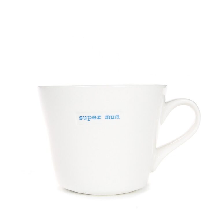Designed by Keith Brymer Jones to be practical in the home and pleasing to the eye, this simple yet stylish bucket mug is perfectly formed from super white porcelain and hand stamped with ‘super mum’. The mugs’ beautiful, satisfyingly cosy shape contrasts with its clean, subtle exterior, giving the mug a country feel but with urban elegance.