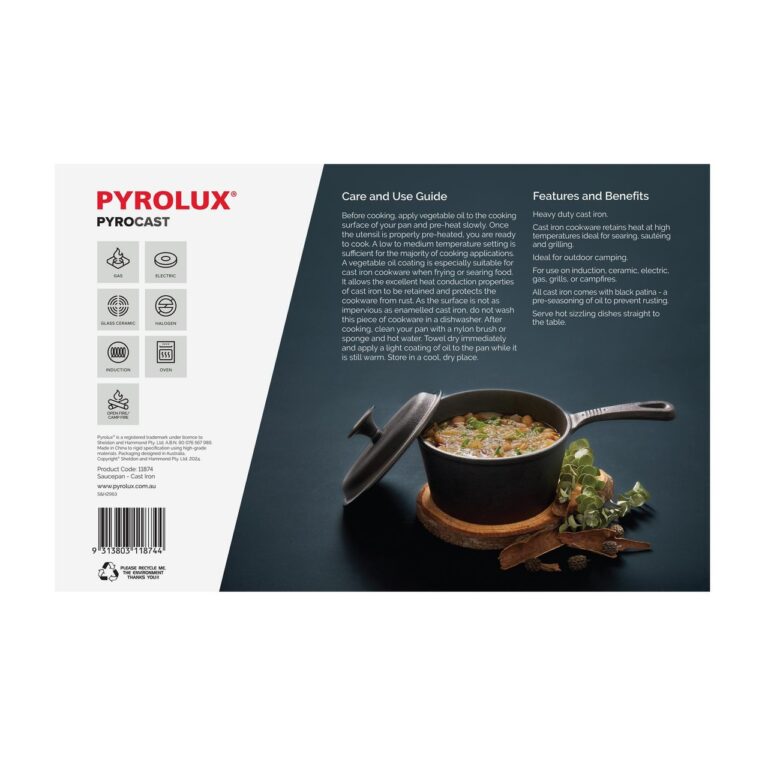 This 19cm/2 Litre PYROCAST saucepan with close fitting lid is the perfect size for larger portions of sauces, soups or stews. Crafted from tough, hardwearing and durable quality cast iron to provide perfect heat retention, This saucepan can be used on all cooktops, including induction. Ideal for home cooks, restaurants or outdoor camping. Take care of your cast iron pan and you will enjoy a lifetime of cooking and create an heirloom for future generations!