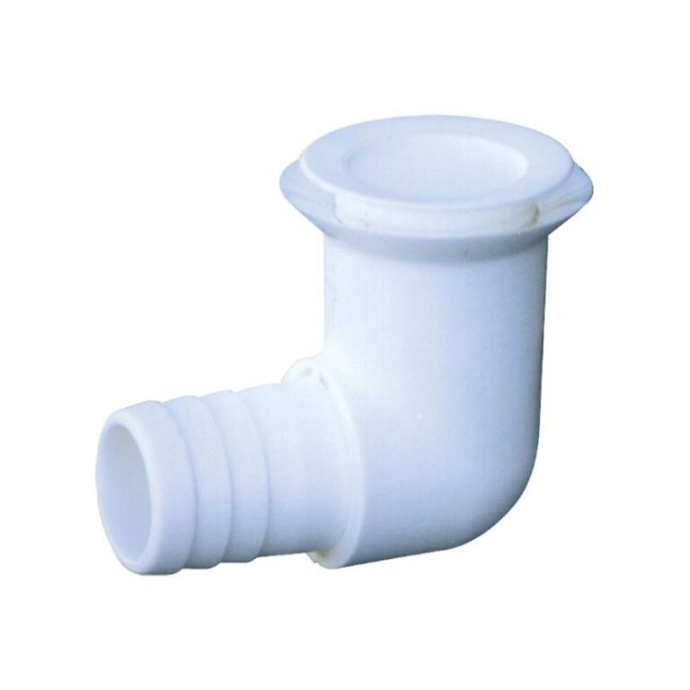 Countersunk flush drain, 90º elbow configuration moulded from white nylon