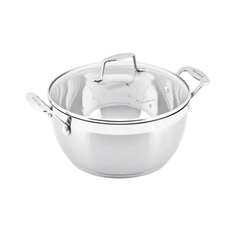 This Scanpan 26cm/4.5L Covered Stew Pot has elegant lines and has a stylish two tone matt/polished appearance with a glass lid to enable easy viewing of your cooking in progress. The optimal 6.4mm thick bonded sandwich base ensures optimal heat distribution. Compatible with all energy sources including induction, this range is as wide as it is popular. The rim design allows for drip-free pouring and the handles are secured with heavy duty rivets. The contemporary satin finish and polished internal finish suits all kitchen decor.
