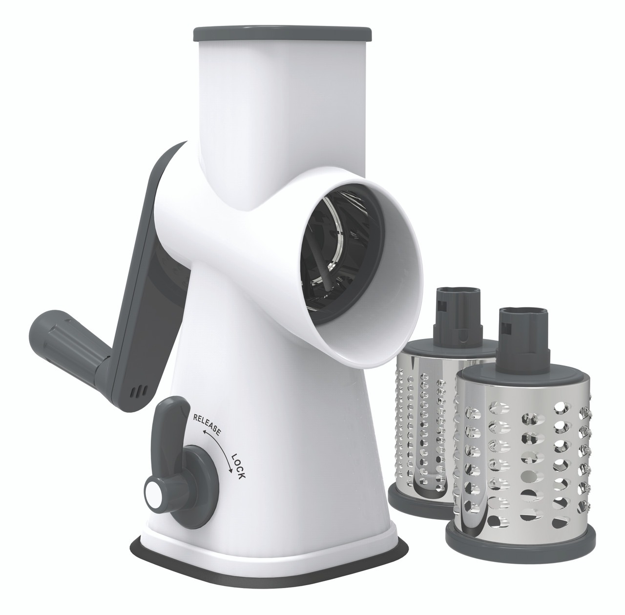 Breeze through your kitchen prep work with the Avanti® Tabletop Drum Grater. A fast, efficient hand-powered rotary grater that quickly and easily grates, shreds and slices cheese, vegetables, biscuits, nuts and more. Featuring a wide hopper that allows substantial quantities of food to be grated or sliced in seconds and a food pusher that keeps fingers away from the blades. Three different stainless steel drum blades deliver fine grating, coarse grating/shredding and slicing. Drum blades switch out for easy cleaning. An angled dispenser reduces any clogging and a suction base securely attaches the unit to a clean, dry, non-porous surface. A reliable and durable does-it-all countertop companion!