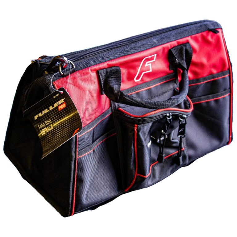 A professional grade tool bag that is water resistant and has a variety of different sized storage compartments.
