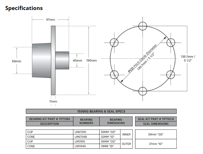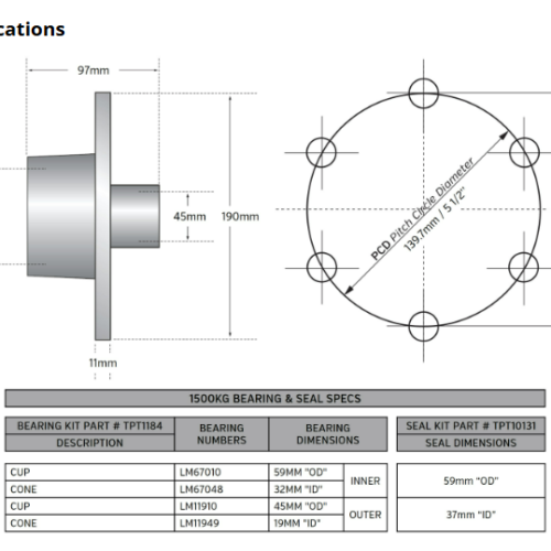 TRAILER HUB SET TROJAN 6 x 5-1/2 X 1/2 1500kg (FLANGE DIAMETER = 190mm)